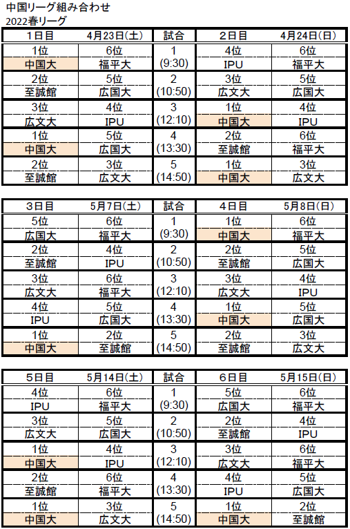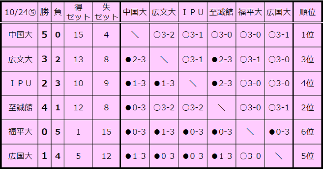 | 第5試合 | 広文大 3-1 IPU | 中国大 3-1 IPU | 中国大 3-2 広文大 |